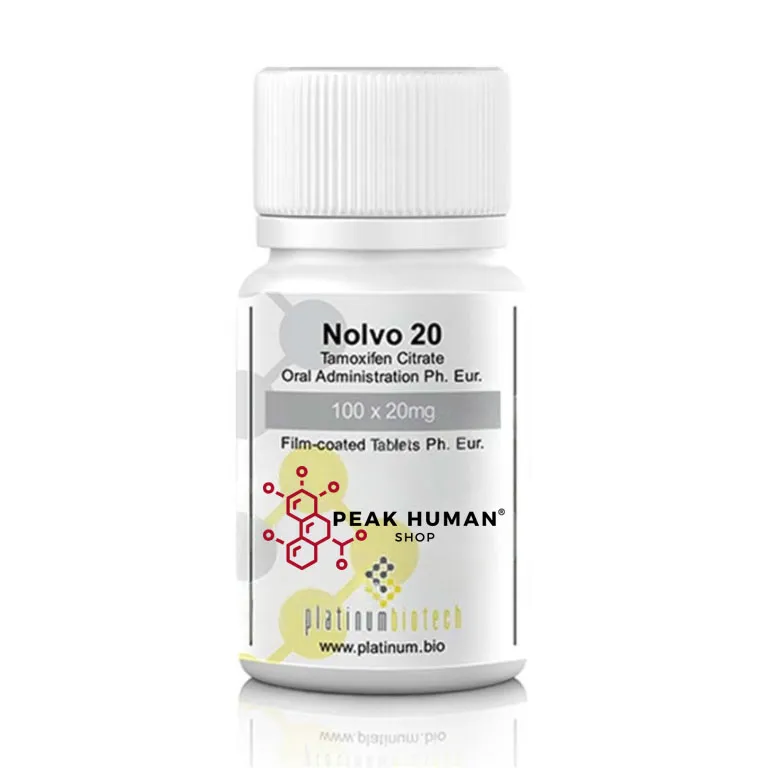 Platinum Biotech Nolvo 20 contains Tamoxifen Citrate with a labeled strength of 20 mg per tablet. The product is manufactured and packaged under the Platinum Biotech brand and presented in sealed packaging for identification and reference purposes.
